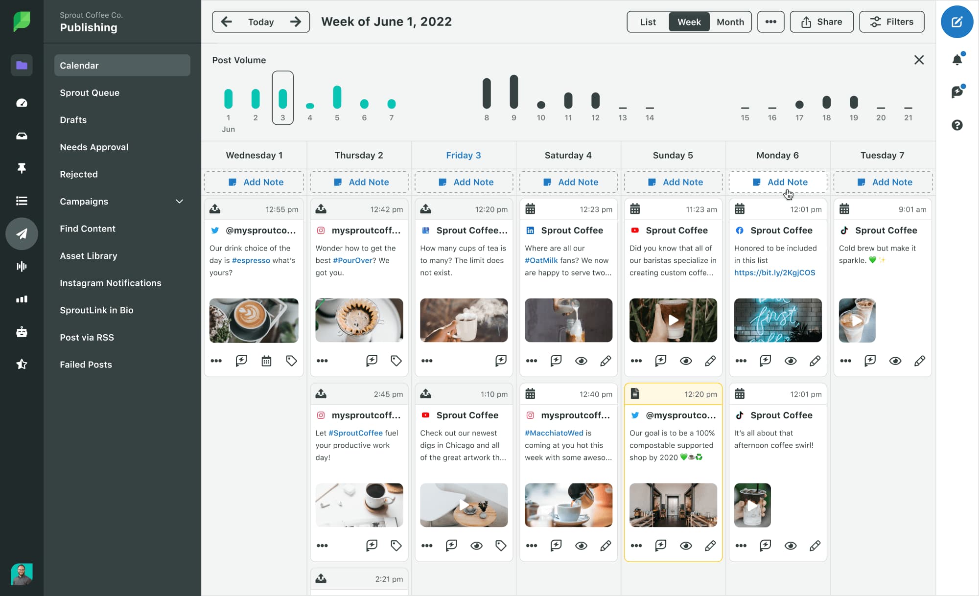 さらに、Sprout Socialには、Hootsuiteにはない機能として、リマインダーをピン留めしたりチームへの連絡事項をメッセージとして残したりできる便利なメモツールがあります。これは、クライアントやチームメンバーとのコラボレーション時に特に役立ちます。Sprout Socialは、コンテンツの表示方法において柔軟性を重視しているため、週表示、月表示、リスト表示を切り替えることができます。投稿のプレビューといコマンドを表示する拡張ビュープラットフォームアイコンと特定の時間に予定されている投稿数のみを表示するコンパクトビューから選択できます。