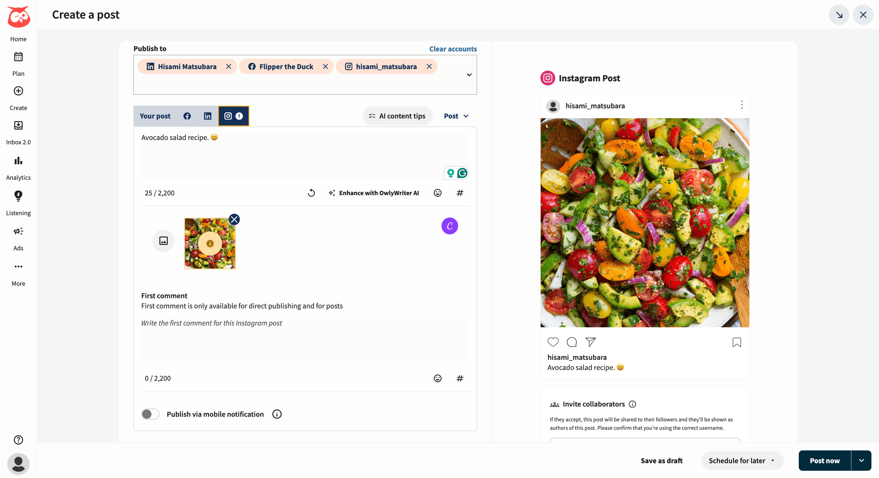 しかし、投稿をカスタマイズする方法はいくつかあります。例えば、Pinterestではタイトルを設定したり、ピン留めするボードを選択したりすることができます。Instagramでは、コラボレーターの追加、場所、人物、製品のタグ付け、さらには最初のコメントを追加することもできます。