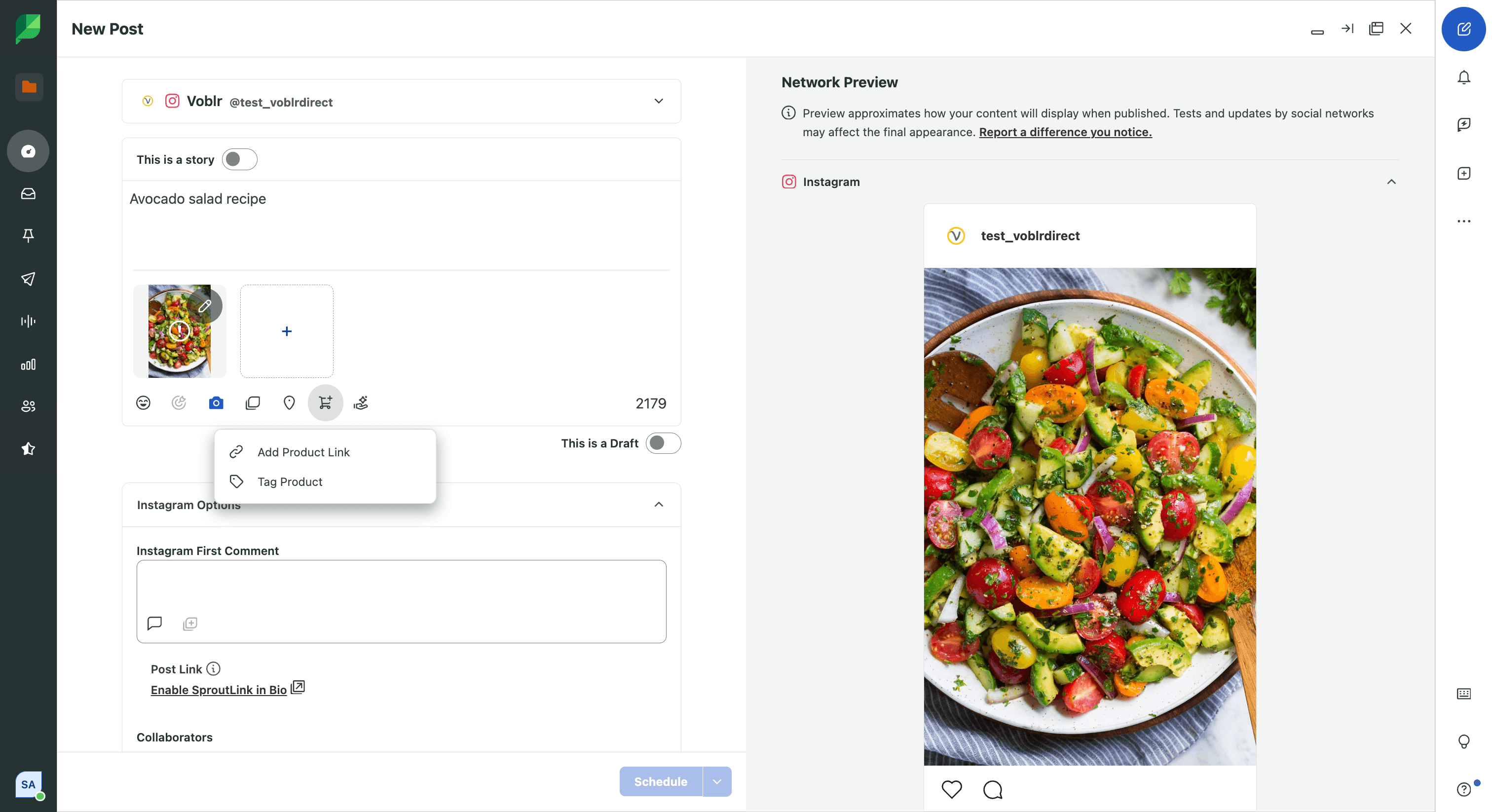 Sprout Socialの投稿エディターでは、キャプション、画像、動画を追加して一から投稿を作成することが簡単にでき、エディターとしての直感性は圧倒的にSprout Socialでしょう。特に右手にプレビューが広がり、左手で「承認ワークフロー」「タグ(おすすめのラベルも提示)」「予約方法の選択」「プロモート」なども上から下に編集していくだけだからです。