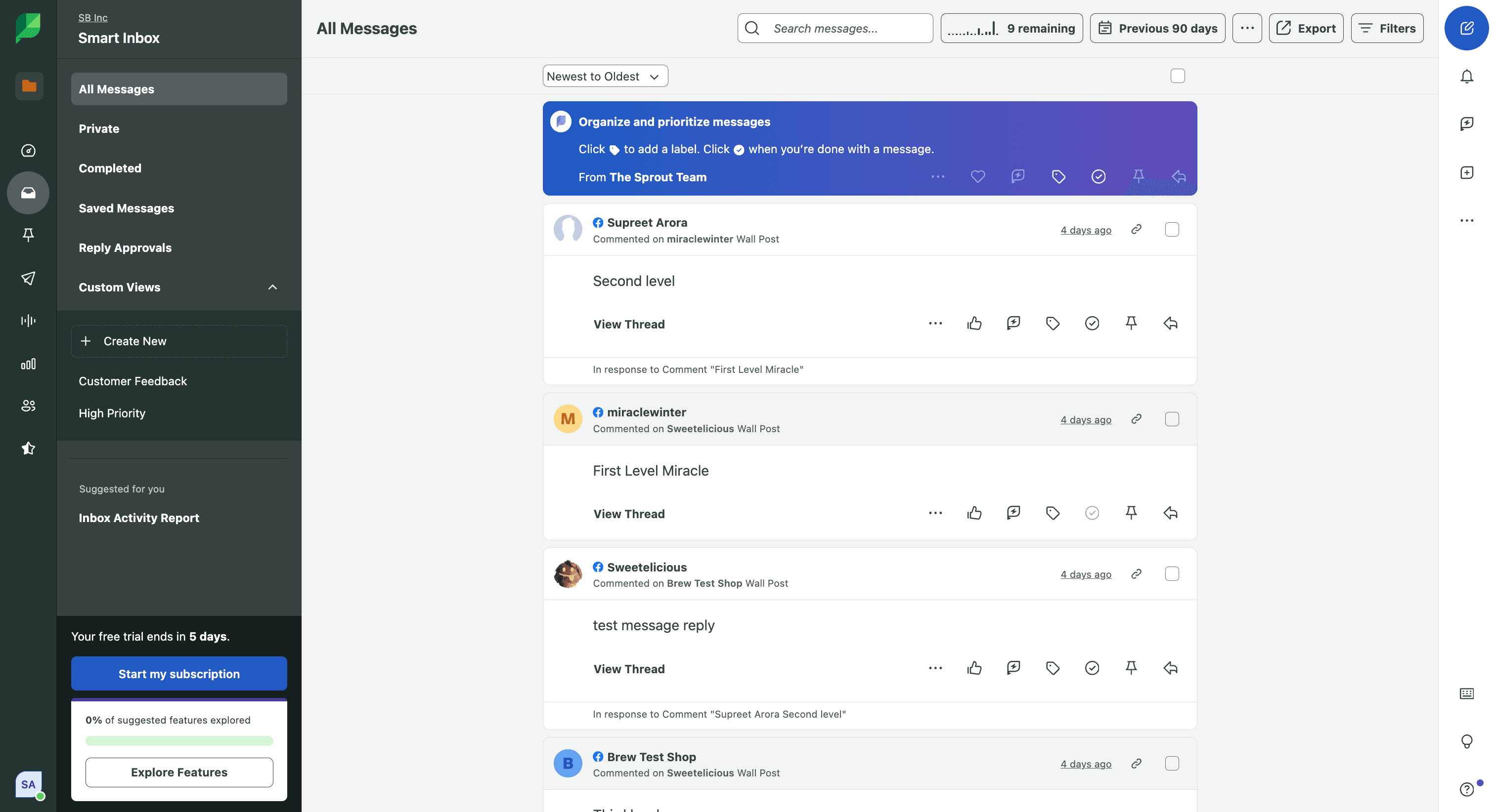 Sprout Socialのインボックス(Inbox)機能では、日常的なソーシャルメディアのコメント対応ができるようになっています。それぞれコメントやメッセージに返信機能がついています。