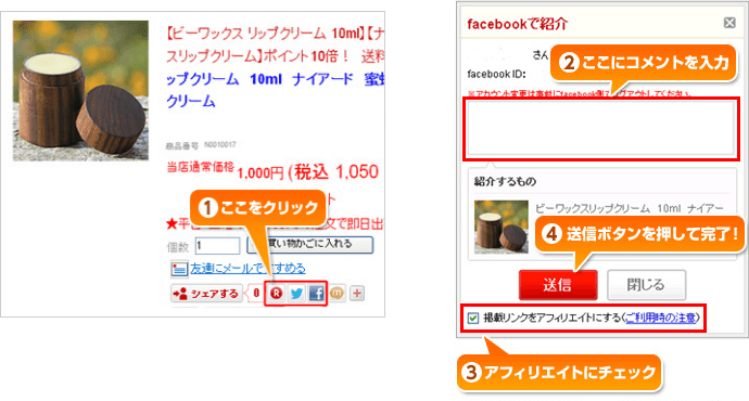 ①商品リンクを「楽天ブログ」、「Facebook」「Twitter」に投稿する。