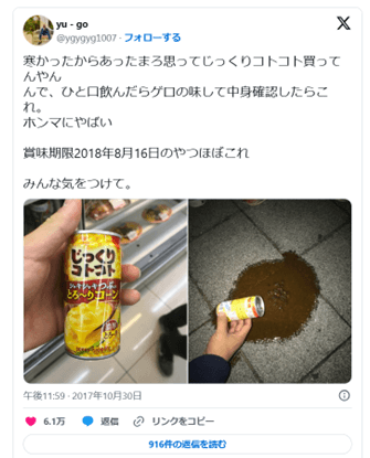 最近、目に新しい投稿は、コーンポタージュスープの中身が腐っていたと言う投稿かと思います。