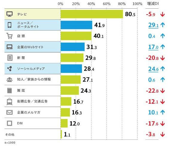 また、消費者に商品認知のきっかけとなっているメディアを複数回答で尋ねると、「テレビ」という回答が80.5%だった反面、デジタルメディアである 「ニュースサイト/ポータルサイト」(41.9%)、「企業のWebサイト」(31.3%)、「ソーシャルメディア」(28.4%)も大きな影響力を持っていることが判明しました。(ADOBE参照)