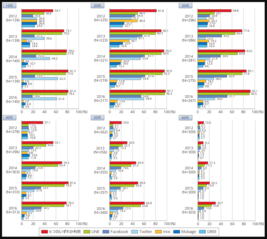 グラフを見てわかる通り、10〜30代のSNS利用率がとても高いことがわかります。40代以降は減少しています。