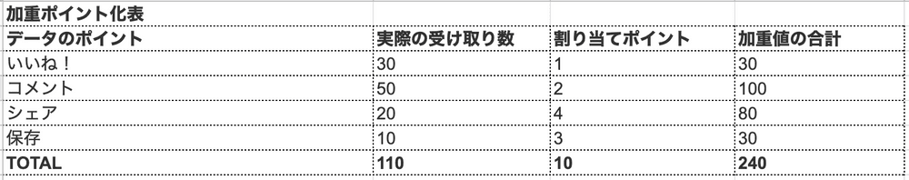 前のセクションで、各変数は、企業のアカウントやビジネス目標によって異なる重みを持つことをちらっと説明しました。そのため、単純な数ではなく、エンゲージメントの価値を加重式に算出することをオススメします。