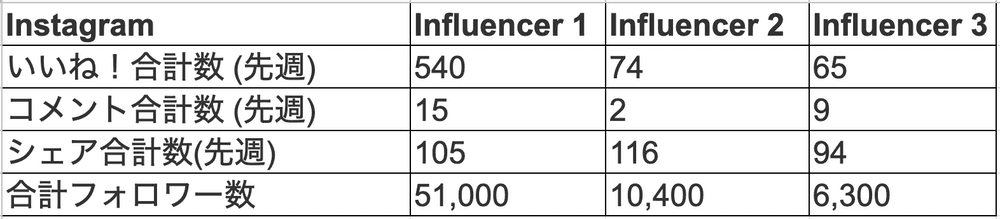 インフルエンサー1=(540+15+105)÷51,000×100=1.29% インフルエンサー2=(74+2+116)÷10,400×100=1.84% インフルエンサー3=(65+9+94)÷6,300×100=2.66%