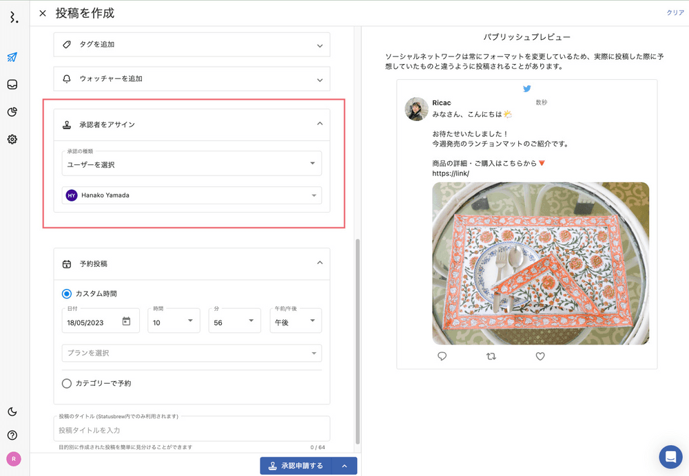 ソーシャルメディアマーケティングツールのStatusbrewなら、投稿内容を承認者としてクライアントをアサインして投稿内容の