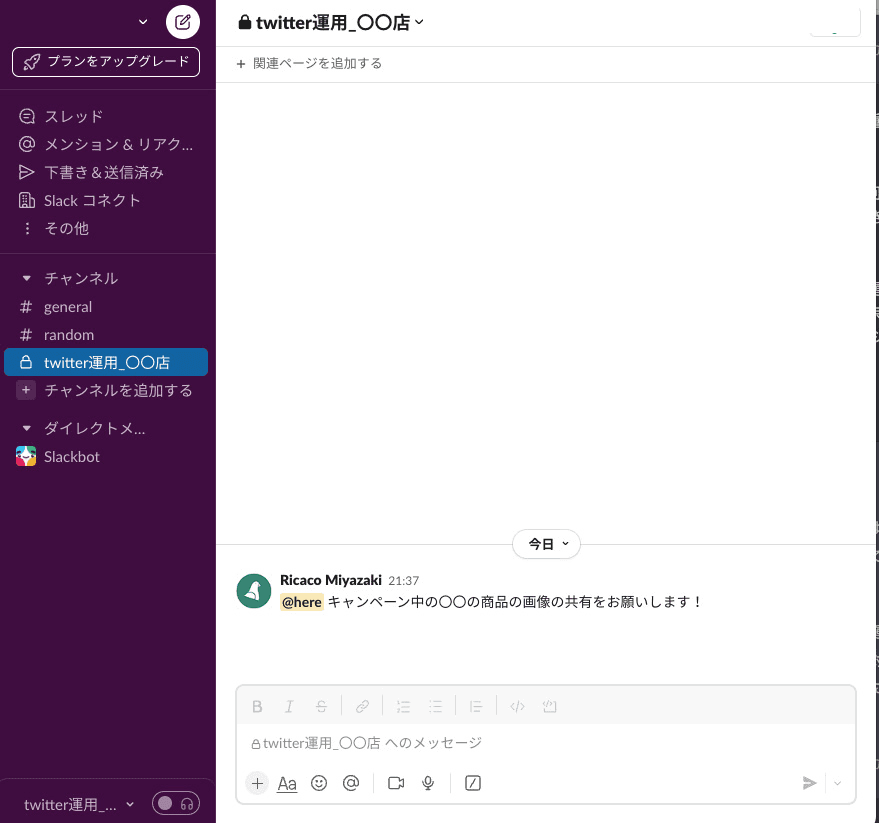 クライアント企業がビジネスチャットツールを使用している場合は、「Twitter運用」「〇〇店Instagram運用」などのソーシャルメディア専用のチャットチャンネルをクライアント側に作っていただき、チャンネルに招待していただく方法もコミュニケーションが取りやすいです。