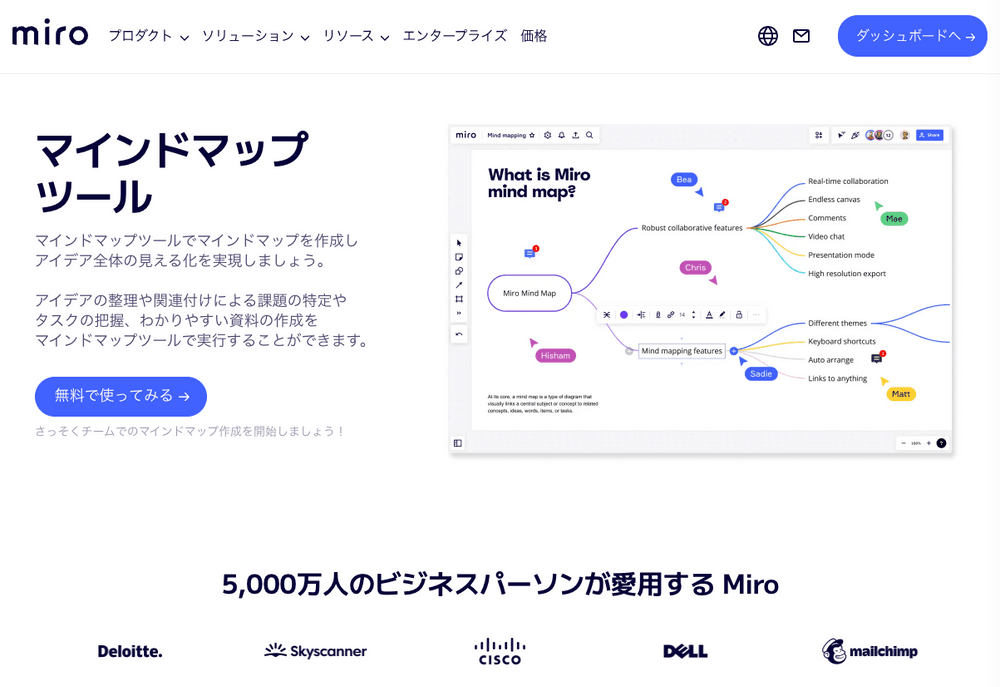 マインドマップツールmiroは、直感的に使用でき、異なる色をマップ上で使用することができるのでヒアリング時の思考整理に役立ちます。