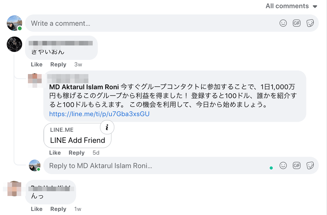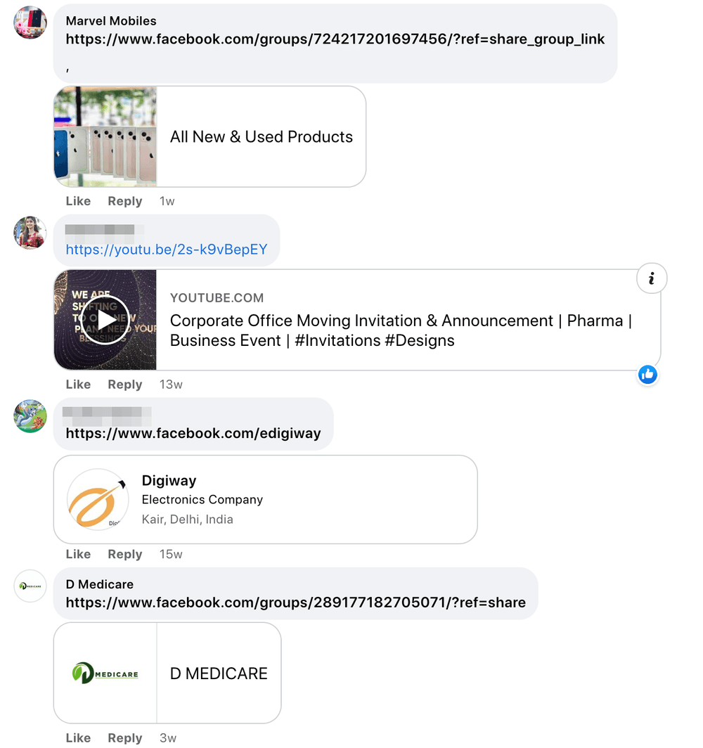 ・スパム - ウィルス性のあるサイトにユーザーを送り込む可能性のあるリンクの付いたFacebookのコメントです。 ・プロモーション - 広告の投稿で、自分のウェブサイトや商品、YouTube動画を宣伝しようとしているユーザーのコメント。