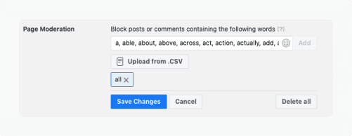 そのためには、Facebookページの管理画面で、日常的に使う「.」などの記号や「to」「you」などの単語を禁止キーワードリストに追加してください。このオプションは、Facebookページの設定 > 一般 > ページモデレーションで見つけることができます。これにより、facebookの投稿や広告に対するすべての着信コメントが非表示になります。