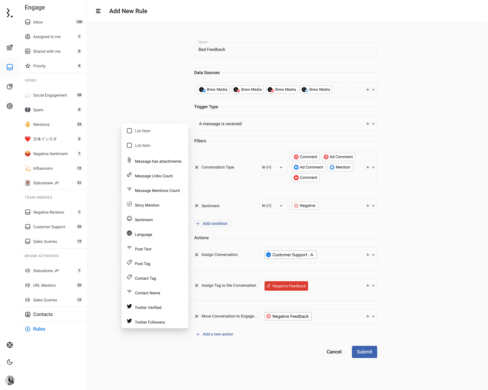 InstagramやFacebookのオーガニック、広告から発生する全てのコメント、DMなどを一つの受信箱に集約し、適切な担当者にアサインしたり、レポート化するためにタグを自動割り振りします。