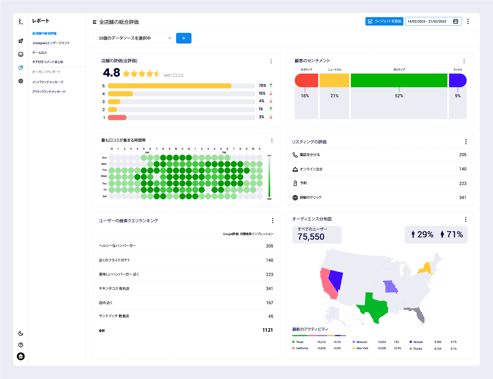 レビューマネジメントレポートは、どのような交流があったかや一般的な摩擦点、トレンドや興味、よくある問い合わせなどを記録するのに役立ちます。このようなレポートを評価することで、ブランドの評判を維持するための戦略に役立ちます。