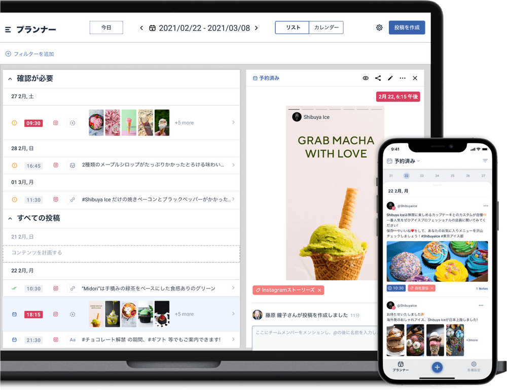 StatusbrewはInstagramのフィードとストーリーズの予約投稿ができます。特にビジネス目的でチーム体制で運用していたり、クライアントのストーリーズを作成している場合にはStatusbrewのInstagramコンテンツのタスク管理機能が便利です。