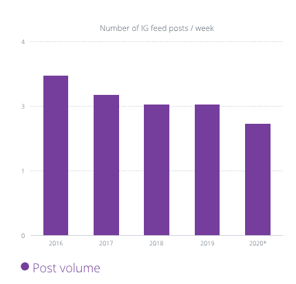 フィード投稿は莫大な数のコンテンツで飽和状態になっており、同じビジネス仲間のなかで目立つことが難しくなってきているようです。実際に、Instagram自体のユーザーは世界中で増え続けているものに対して、フィード投稿の投稿数は年々減少しています。