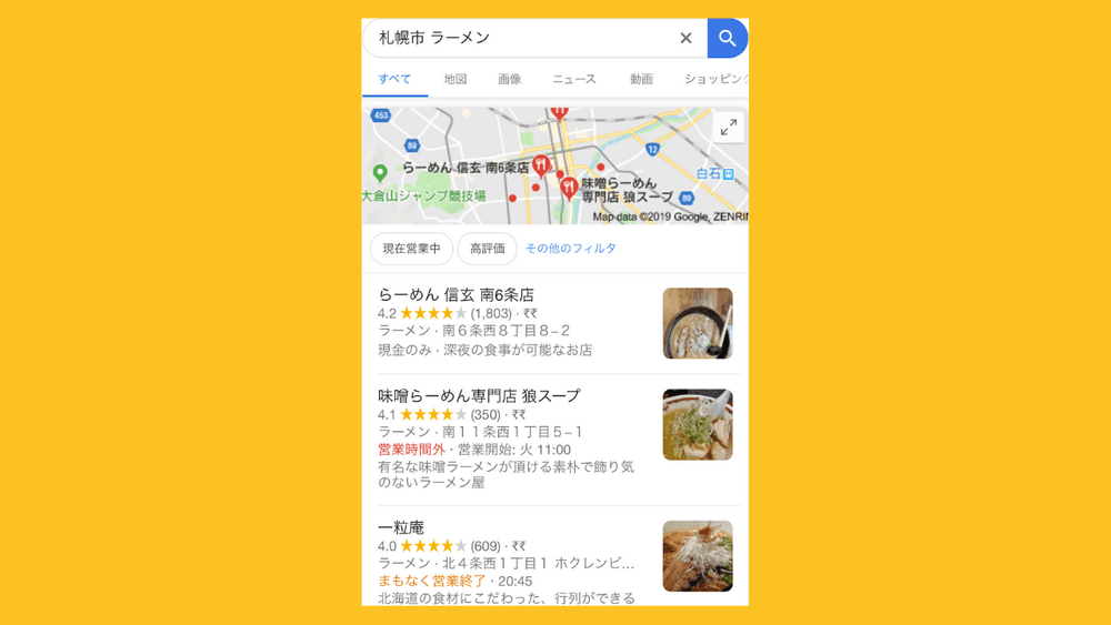 こちらの画像をご覧いただくと、地図がありその下にお店が3店舗載っています。 このお店がGoogleが判断した近くにあるオススメのラーメン店になります。