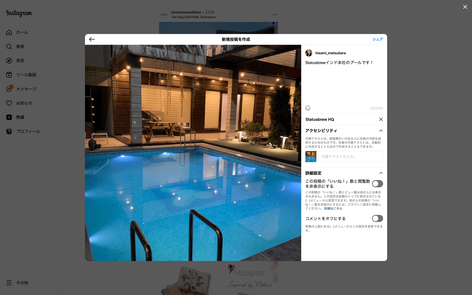 Step8: 画像を選んだり、キャプションを入力、位置情報やタグ付けなど普段と同じように作業ができます。