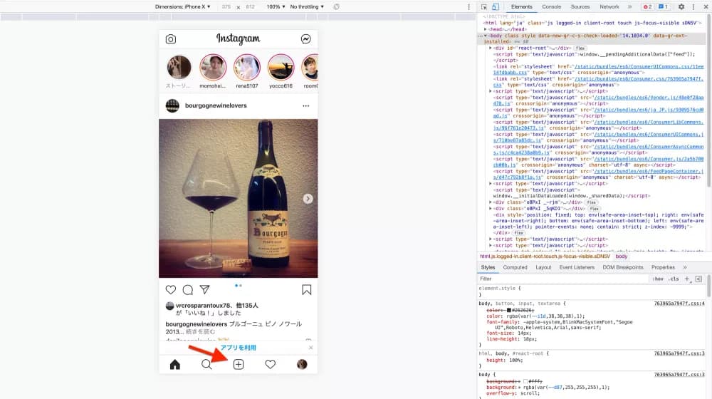 Step7:スマホと同じように下に「プラス」のアイコンが表示されます。これで、スマホから投稿するのと同じように、PCからインスタグラムに投稿できるようになりました! +アイコンをクリックして、投稿したい写真をパソコンから選択します。