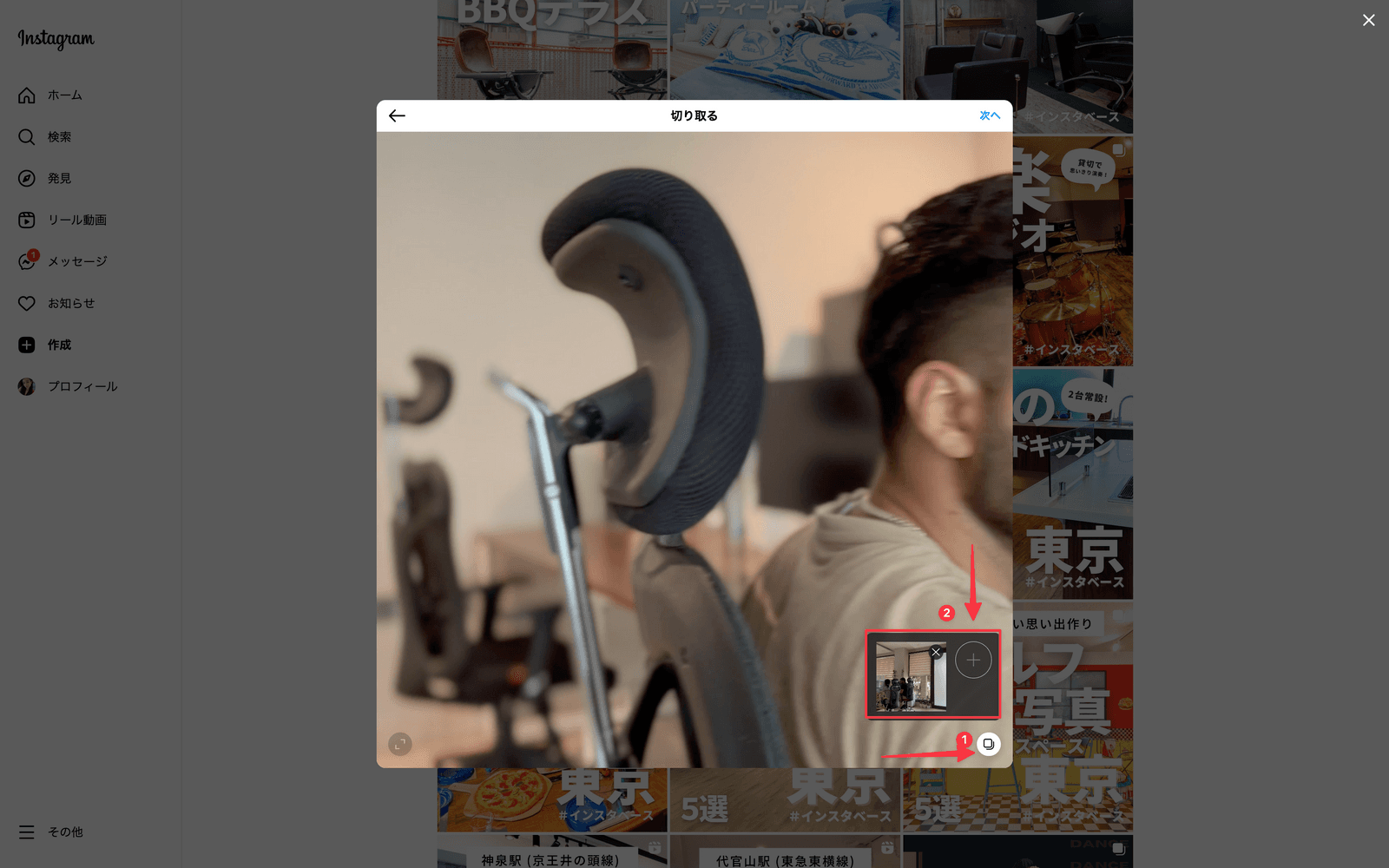 もしカルーセル投稿を行いたい場合は、1つ目の画像または動画をアップロードしたのち、右下の複数枚専用ボタンをクリックすると、+マークが表示されるので、クリックしてください。同様にローカルファイルが開き、次のメディアをアップロードすることができます。