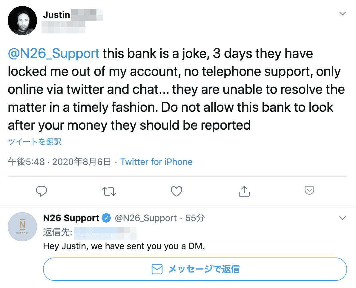 N26のカスタマーサポート専用アカウントの対応。DMでの対応を促していますね。