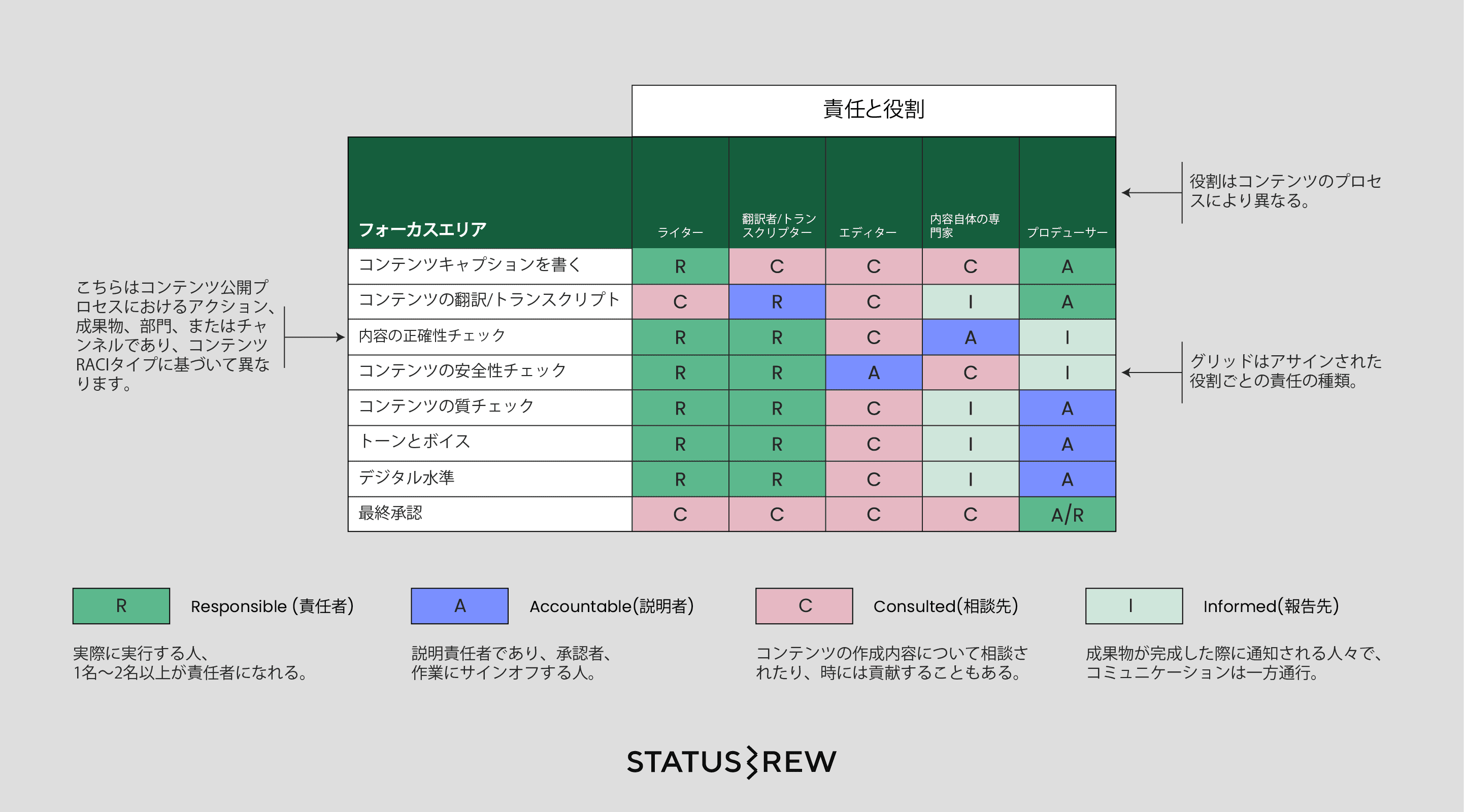 コンテンツの役割と責任は、継続的にコンテンツのリーダーシップ、所有権、そして実行を伝える必要があります。これを行う最良の方法は、責任マトリックス、またはRACI(Responsible、Accountable、Consulted、Informedの略)を通じてです。