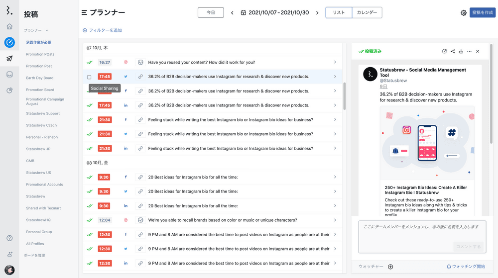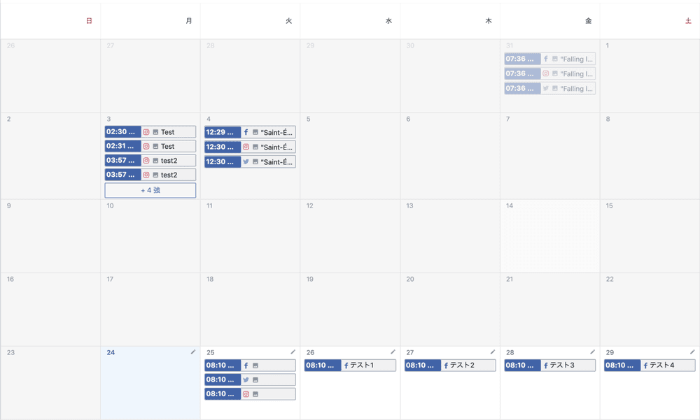セットした投稿は 「どのカテゴリーで予約されたか」 わかるようにStatusbrewのコンテンツカレンダーに並ぶので一発で見てわかります。