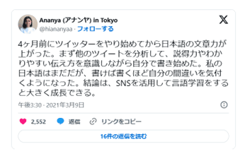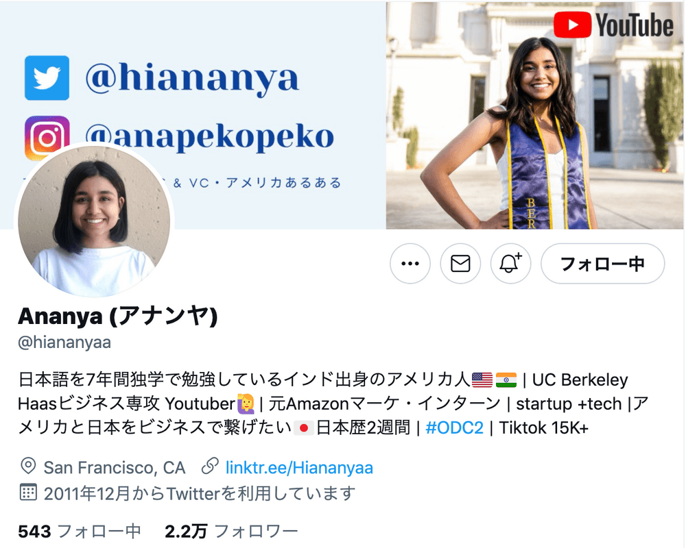もう一人は、同じく「語学学習系」アカウントでご紹介します、こちらのアナンヤさんです!