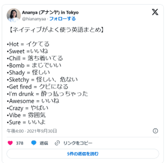 彼女のツイートは、だいじろーさんと同じように、語学学習にまつわるヒント、モチベーションの上げ方、英語の表現方法など様々なコンテンツを常に発信しています。