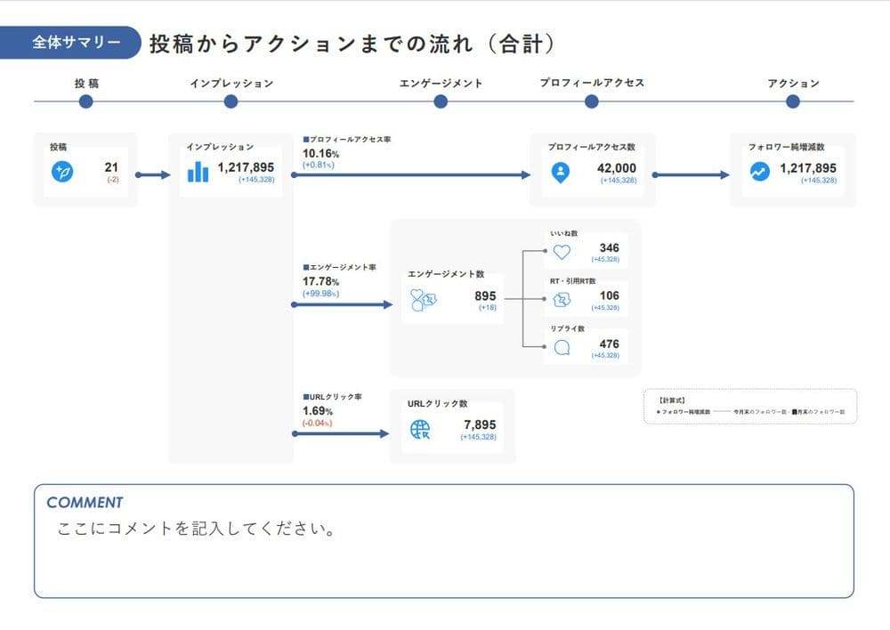 この画像を見るだけでも、インプレッション、相手に投稿表示されてからの行動から得られる指標を考えるだけでも、さっと、プロフィールアクセス数、それぞれのエンゲージメント数、URLクリック数、それらそれぞれの行動の割合が挙げられます。