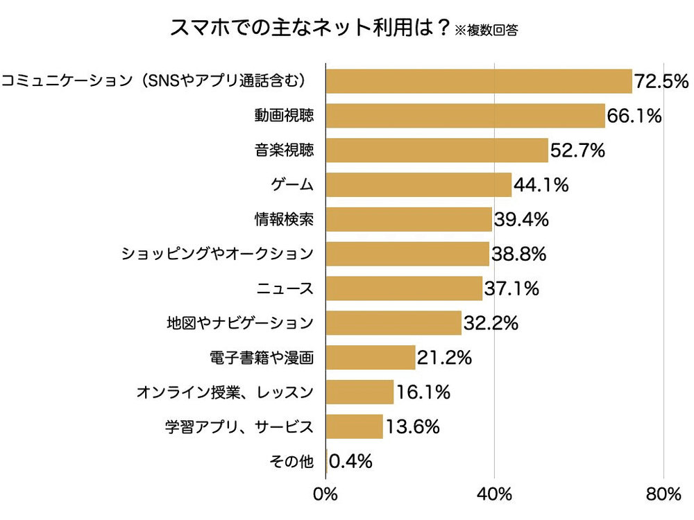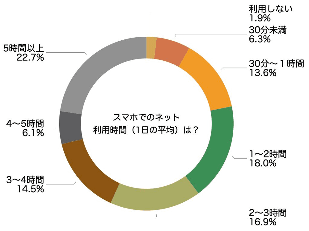 KDDIが18歳から22歳の若者に行った調査によると、スマホでのネット利用時間平均の回答で最も多かったのは、5時間以上(22.7%)であり、その中の使用用途として最も高かったのは、SNS、つまりソーシャルメディアを含むコミュニケーションである。(72.5%)