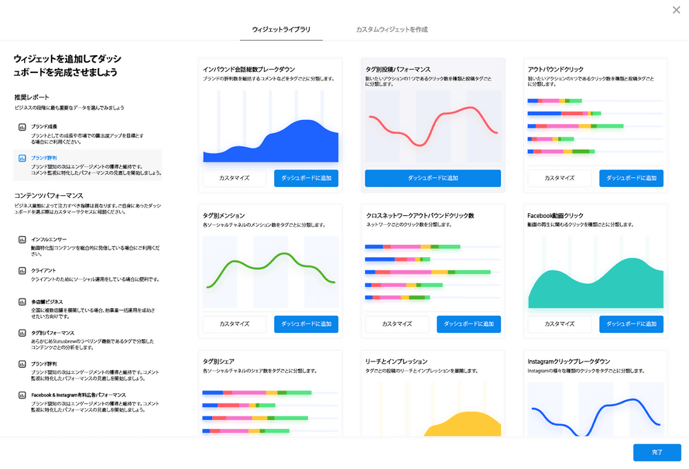 こちらは、200種類以上もの分析指標から独自にカスタマイズを行い、レポート作成を行うことができる完全カスタマイズ機能です。