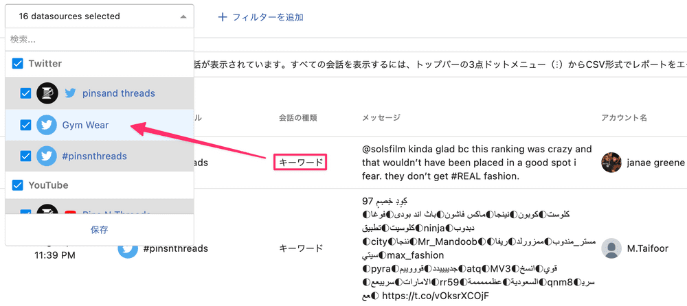 →どのソーシャルチャネルからのデータを取得したいか?を最初に決定します。ここでソーシャルリスニング用に取得したキーワードも選択に含めたり、外したりすることができます。Twitterのリスニングキーワード(例:ジムウェア)はTwitterアイコンで表記されます。