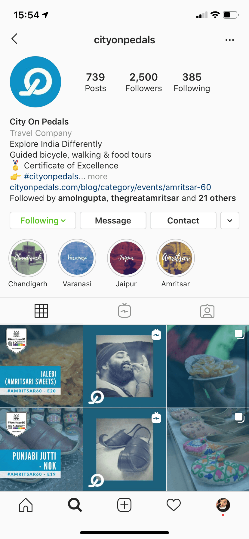 本当にクリエイティブにを人を驚かせるフィードを公開したいのであれば、「グリッド」形式を取り入れるのもありです。約2~3週間前からInstagramの投稿の計画を立てる必要があります。下記はグリッド形式投稿のよい例です。インド発の旅行ツアースタートアップですが、コンテンツの内容によってデザインとグリッドの順序を変えています。真ん中にはIGTVの録画が来るようになっていますね。