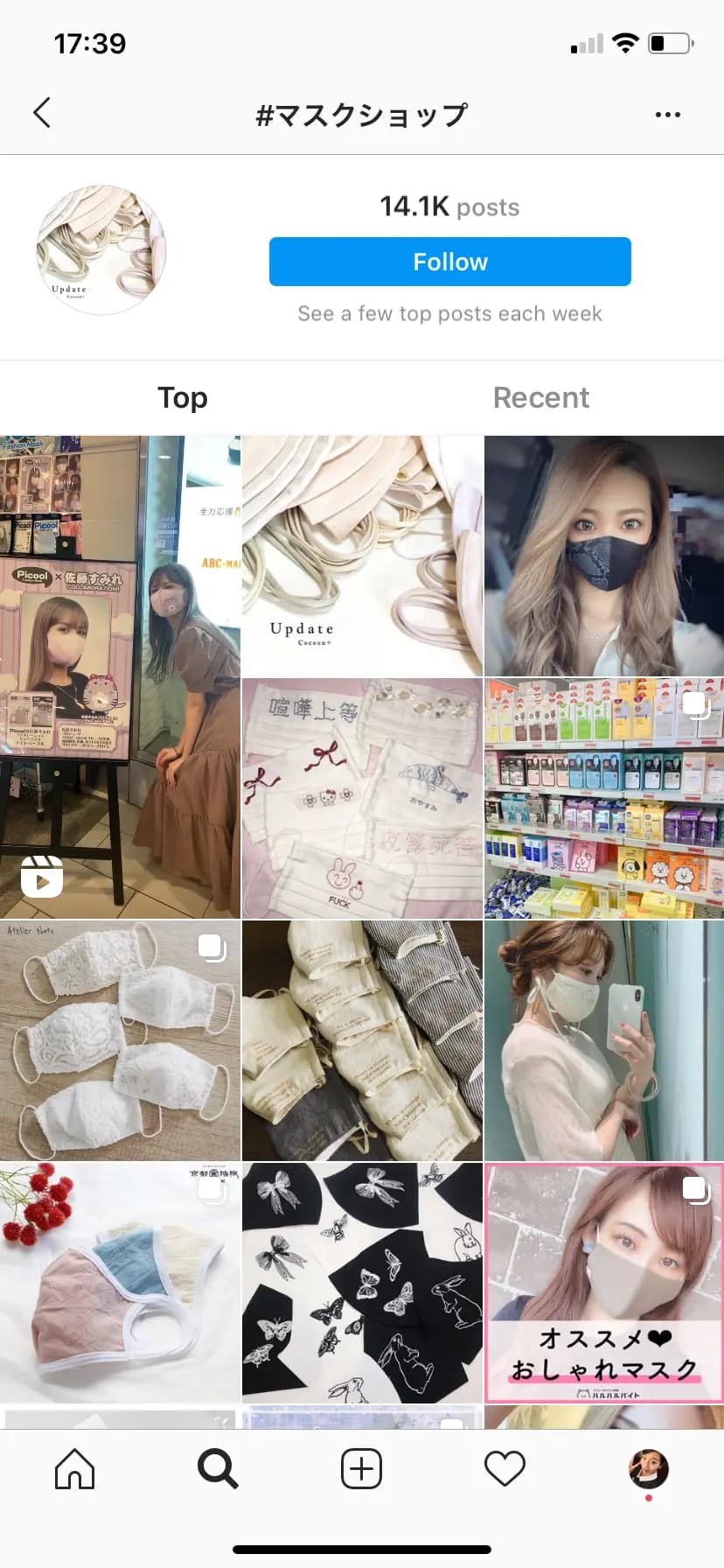 この#マスクの下に表れているハッシュタグが関連するハッシュタグに近しいです。 さらに#マスクショップと限定してトップ投稿を覗いてみましょう。