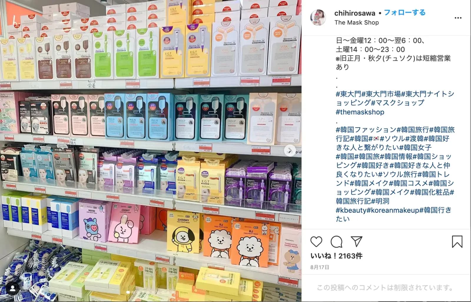 右側は韓国ファッションの買い付けアカウントで、使用している30個のハッシュタグのうち、マスクに関わるものはこの#マスクショップだけでした。 どうしてか?と思い、