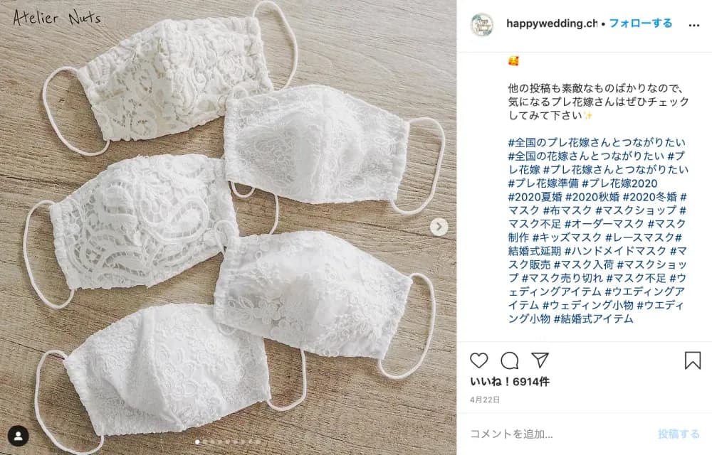 例えばですが、こちら2つの投稿のハッシュタグと内容に注目してみましょう。 左はもともとハンドメイド系のショップで、もともとの商品展開としてマスクを宣伝しており、ハッシュタグもマスク=ファッションに統一しつつ揃えています。