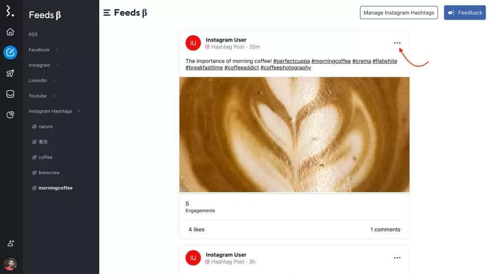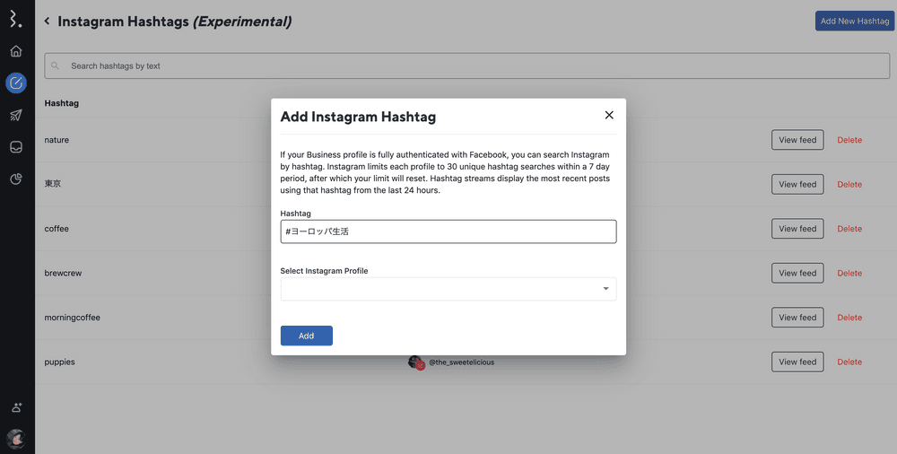 まったく新しいInstagramハッシュタグ機能を使用して、複数のハッシュタグフィードを作成し、Instagramで目的のハッシュタグ周辺のアクティビティをモニタリングします。ハッシュタグをモニタリングすることで、Instagramマーケティングの幅がぐんと広がります!