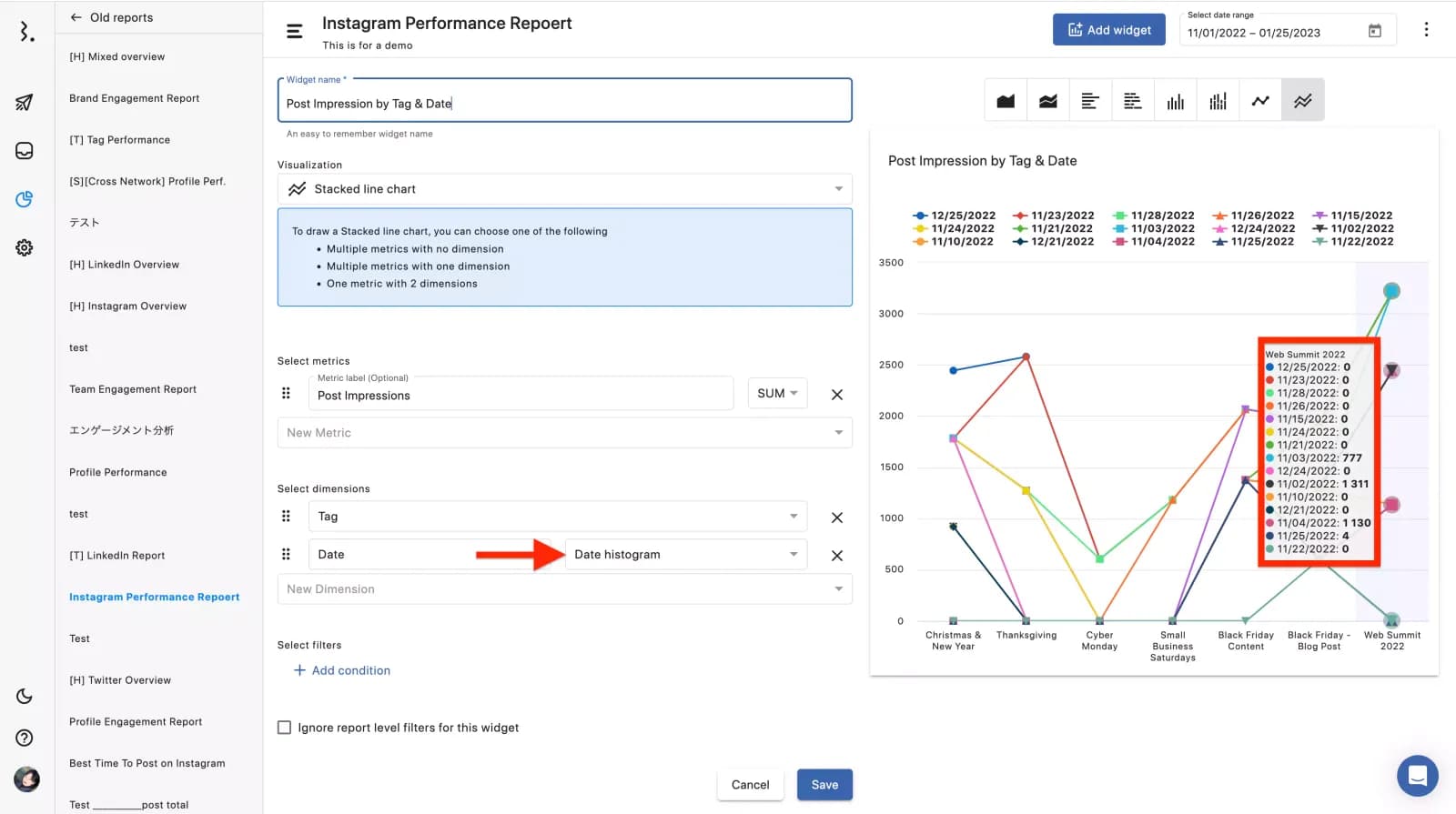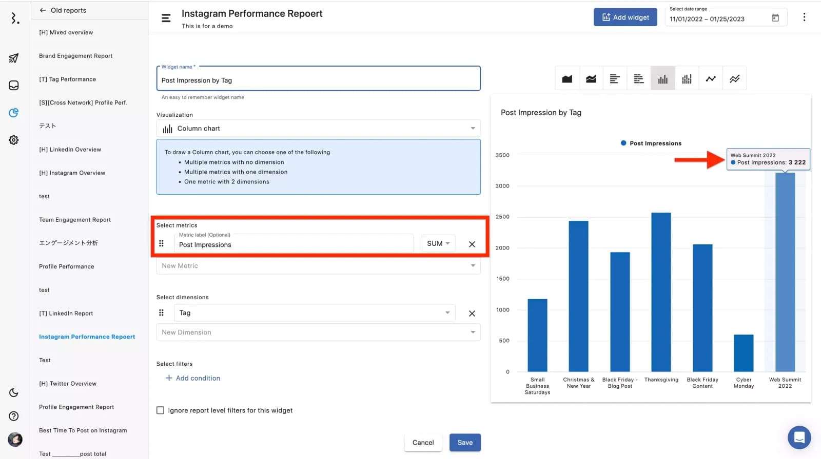 まずはタグごとのインプレッションを任意の分析機関内でデータ化します。すると赤色の矢印がさす、「Web Summit2022」というカテゴリーに当てはまる投稿がその期間内に溜まったインプレッションで導きだします。