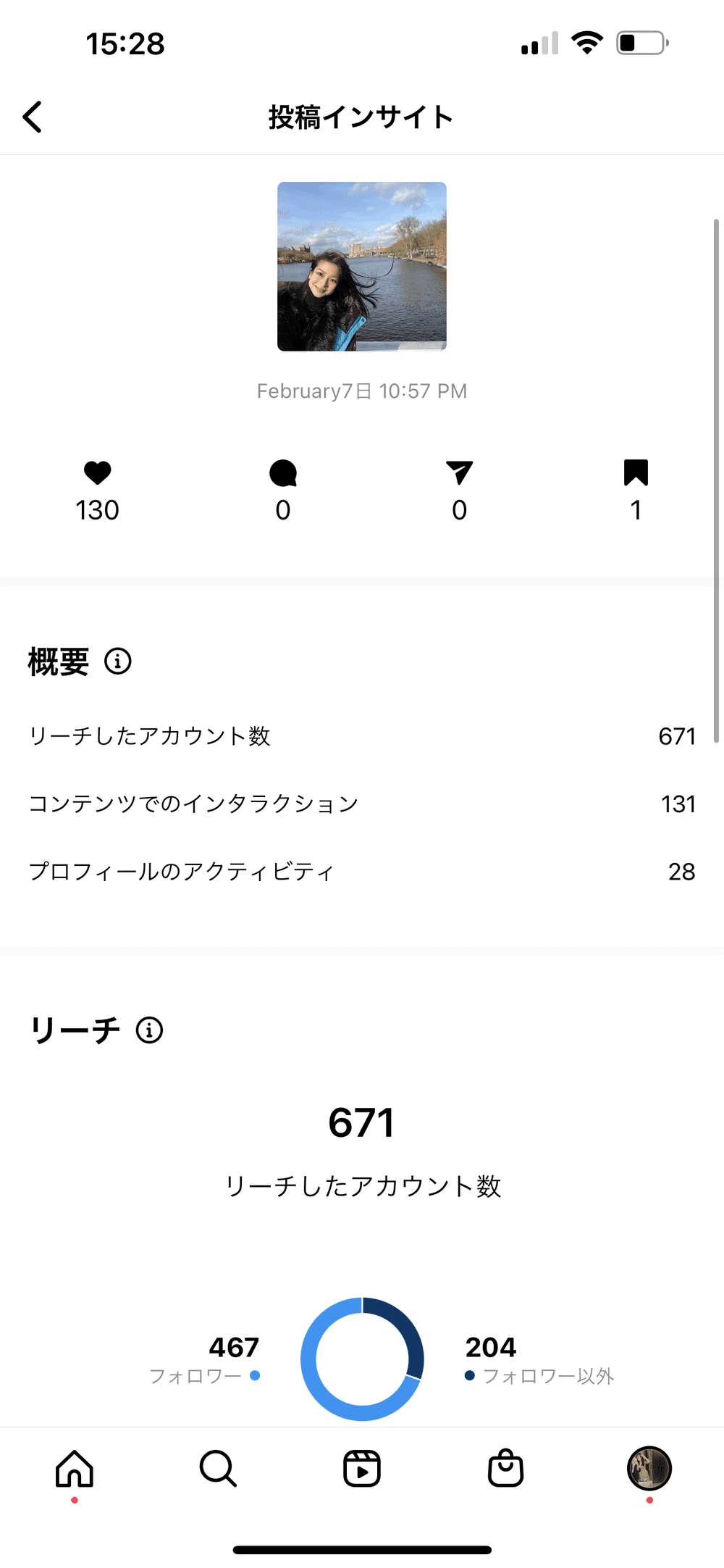 また、リーチしたアカウントのうち、既存のフォロワーと新規ユーザーの割合を確認することもできます。