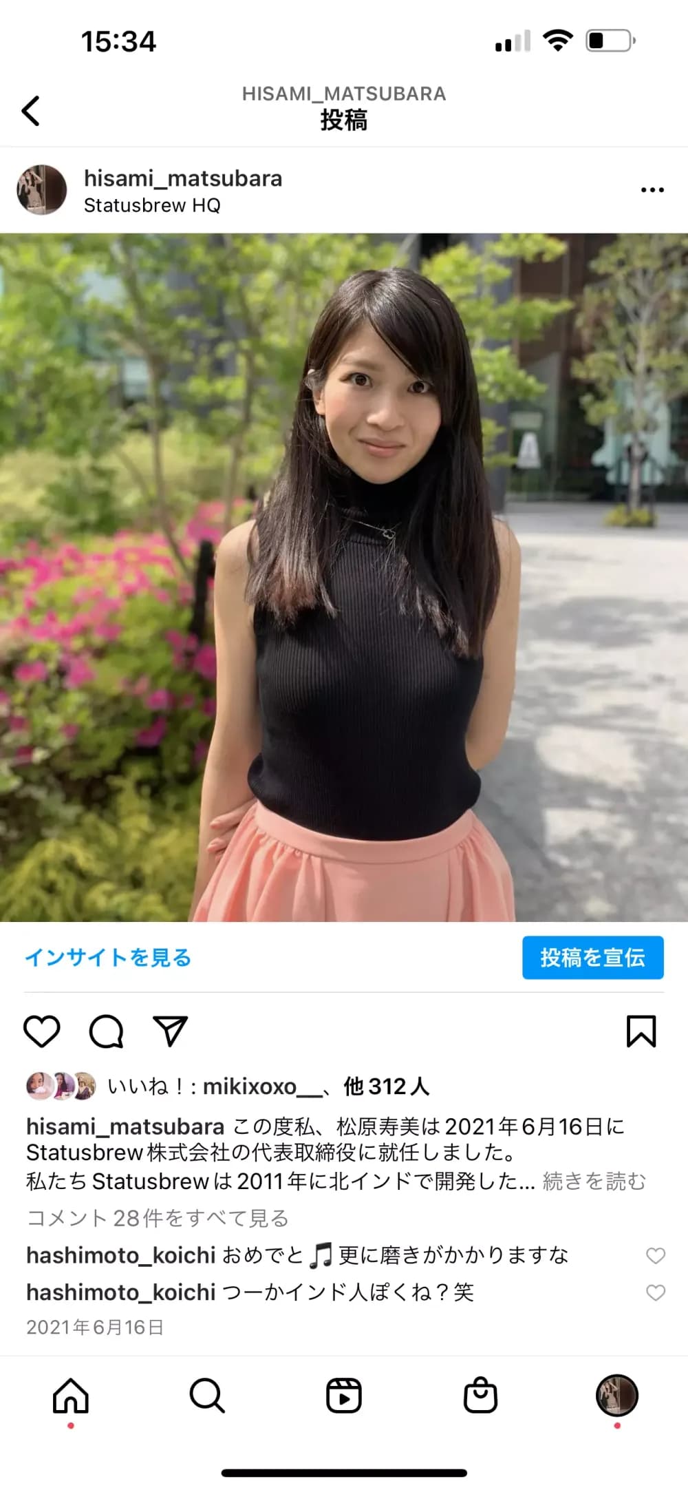 ただし2枚目のフィード投稿(上記)は明らかにフォロワー数に対してリーチとインプレッションが圧倒的に高く、ただ単にスクロールして目に留まっただけではないということがわかります。