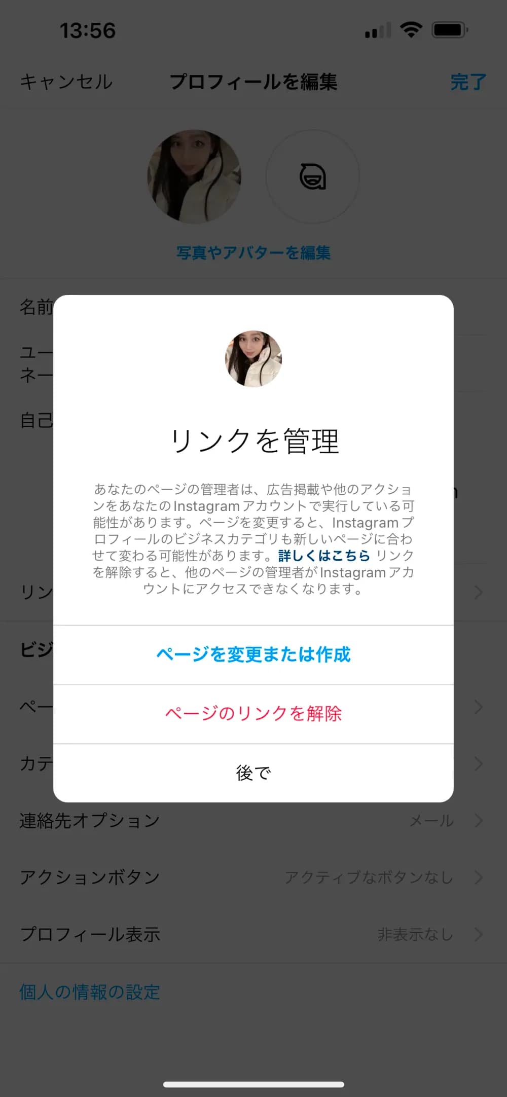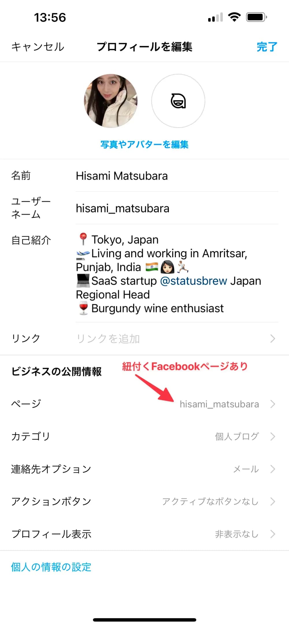 すでにご自身のInstagramアカウントが、紐付くFacebookページをお持ちの場合は、プロフィール>プロフィール編集>ビジネスの公開情報の一番上の欄に、Facebookページの項目があります。