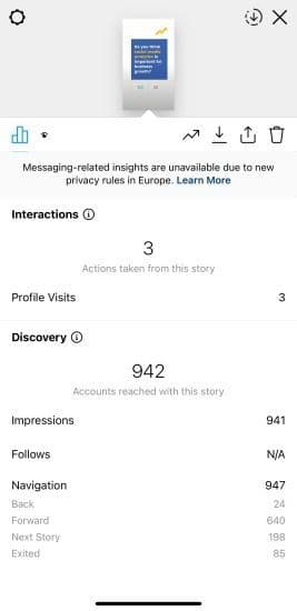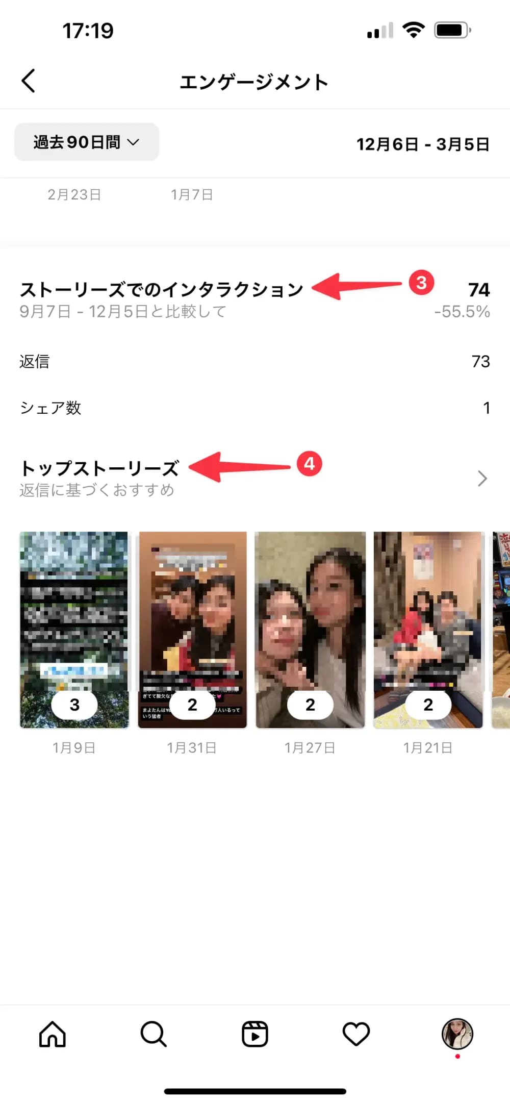 フィード投稿と同様に、ストーリーズ分析にも簡単にアクセスできます。ストーリーズの指標は、ストーリーズのコンテンツ仕様上また少し特殊です。