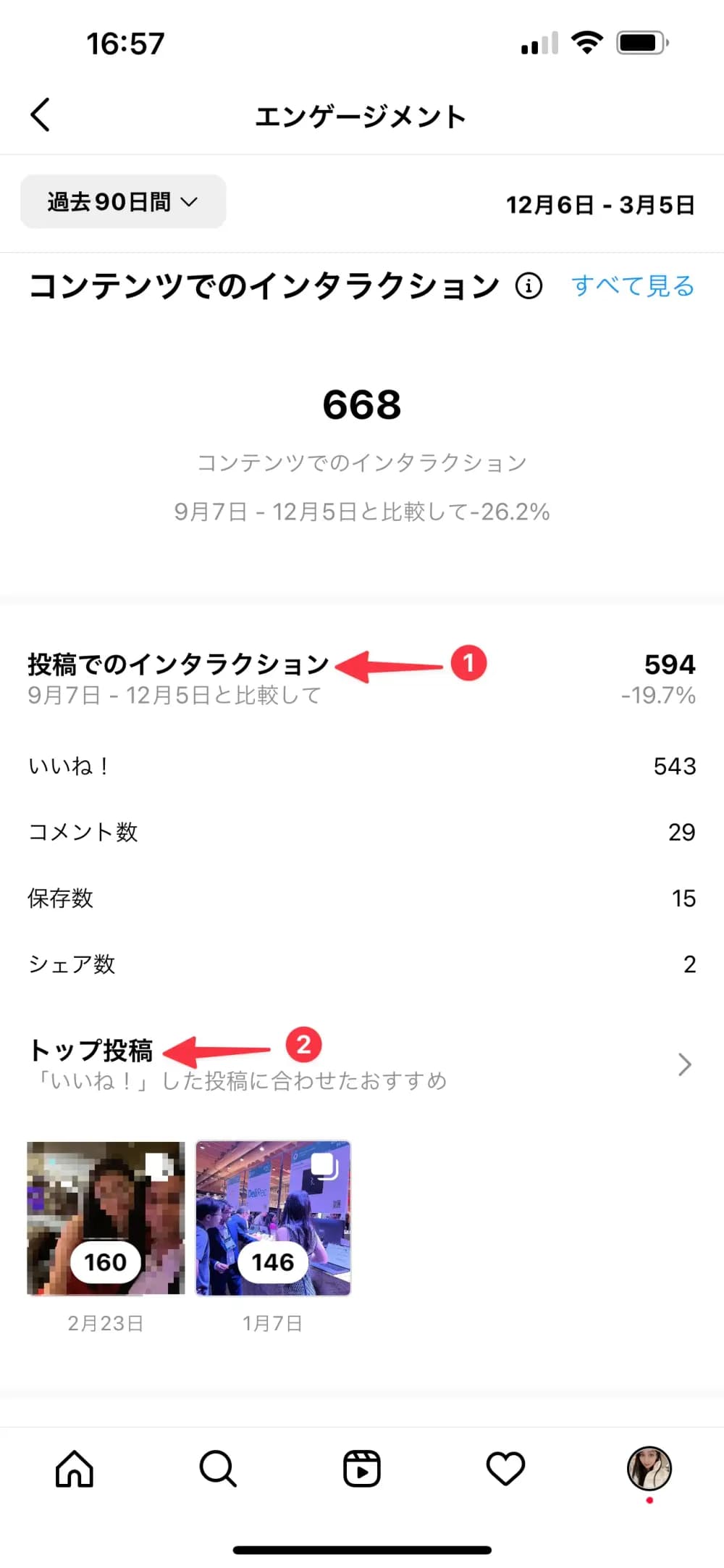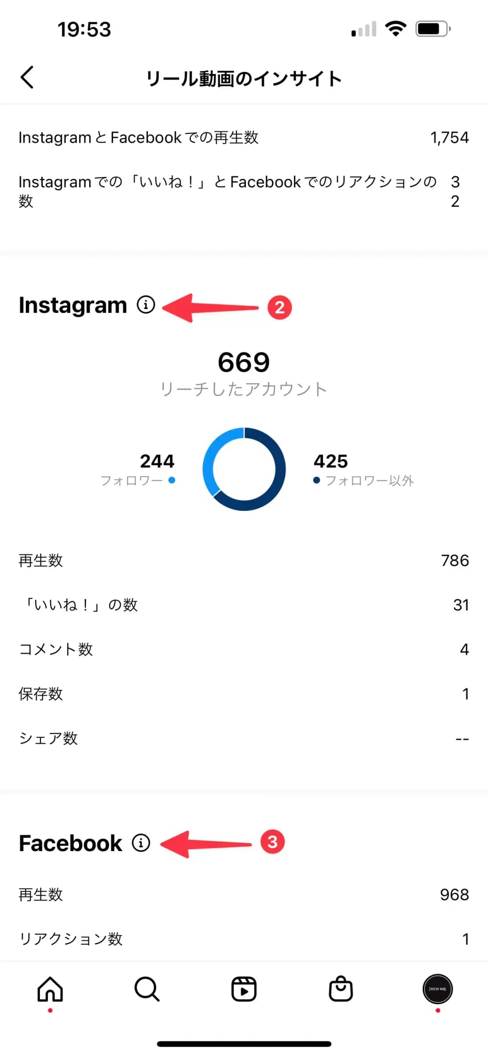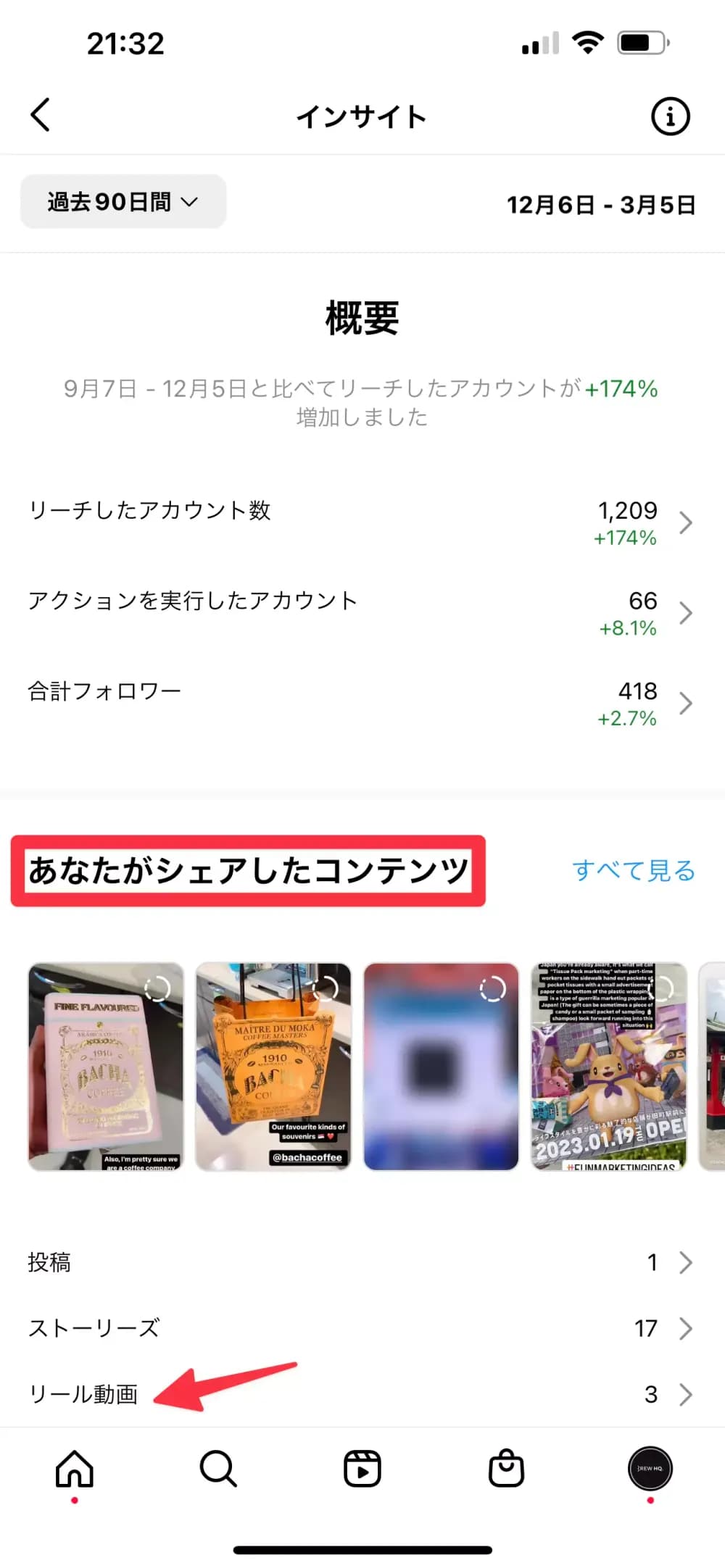 方法1: 「あなたがシェアしたコンテンツ」までスクロールすると、あなたが直近で投稿したフィード投稿が表示されますので、該当の投稿をタップすると基本的なメトリクスと共に分析データが開示されています。