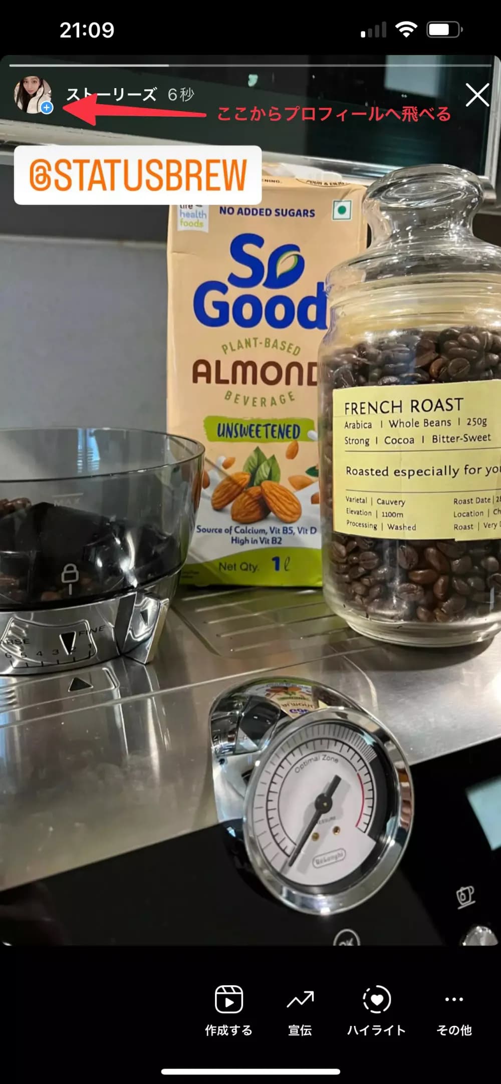 ストーリーズの画面で、左上のアイコンをタップすると、ストーリーズの作成主のプロフィールにジャンプすることができます。