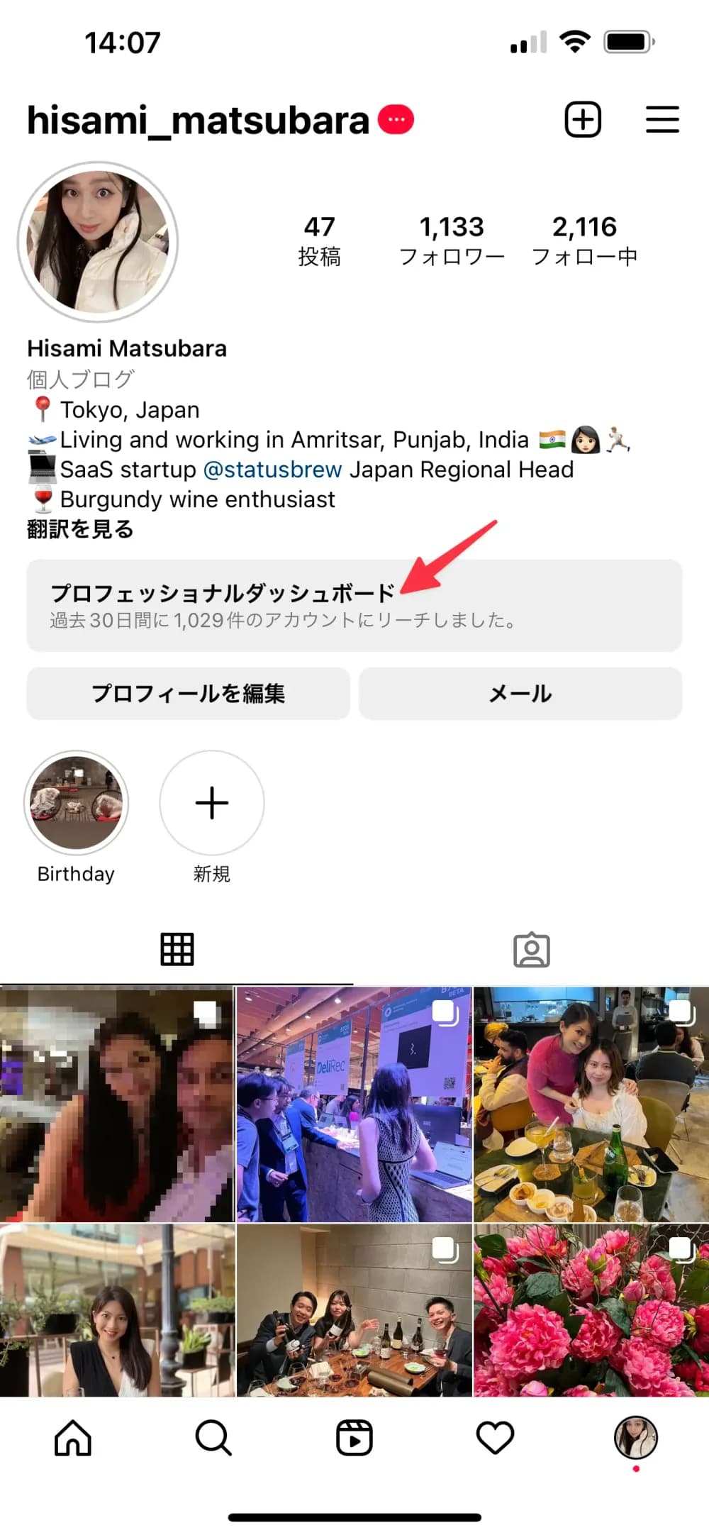 ・自分のプロフィールフィードの中央部分に案内されるプロフェッショナルダッシュボードをタップ