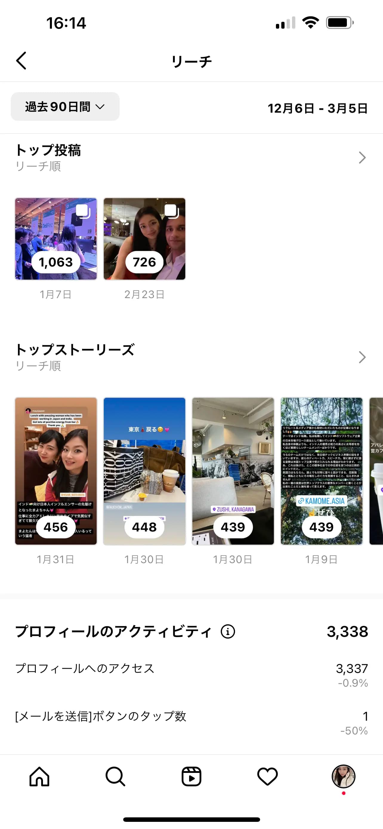 Instagramのインサイトはあなたの投稿のパフォーマンスを測るだけではなく、どんな種類のリーチがあなたのコンテンツの何にめがけてきているのかを把握することができる分析データで、基本的には7日、14日、30日、90日または任意の期間範囲設定ができます。またフィードだけではなくストーリーズ、IGTV、リールのデータも取得することができます。