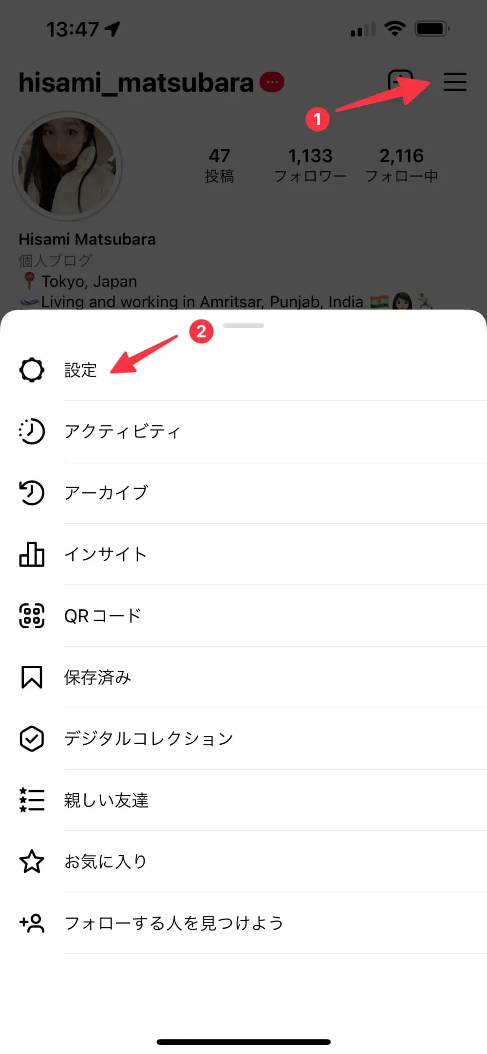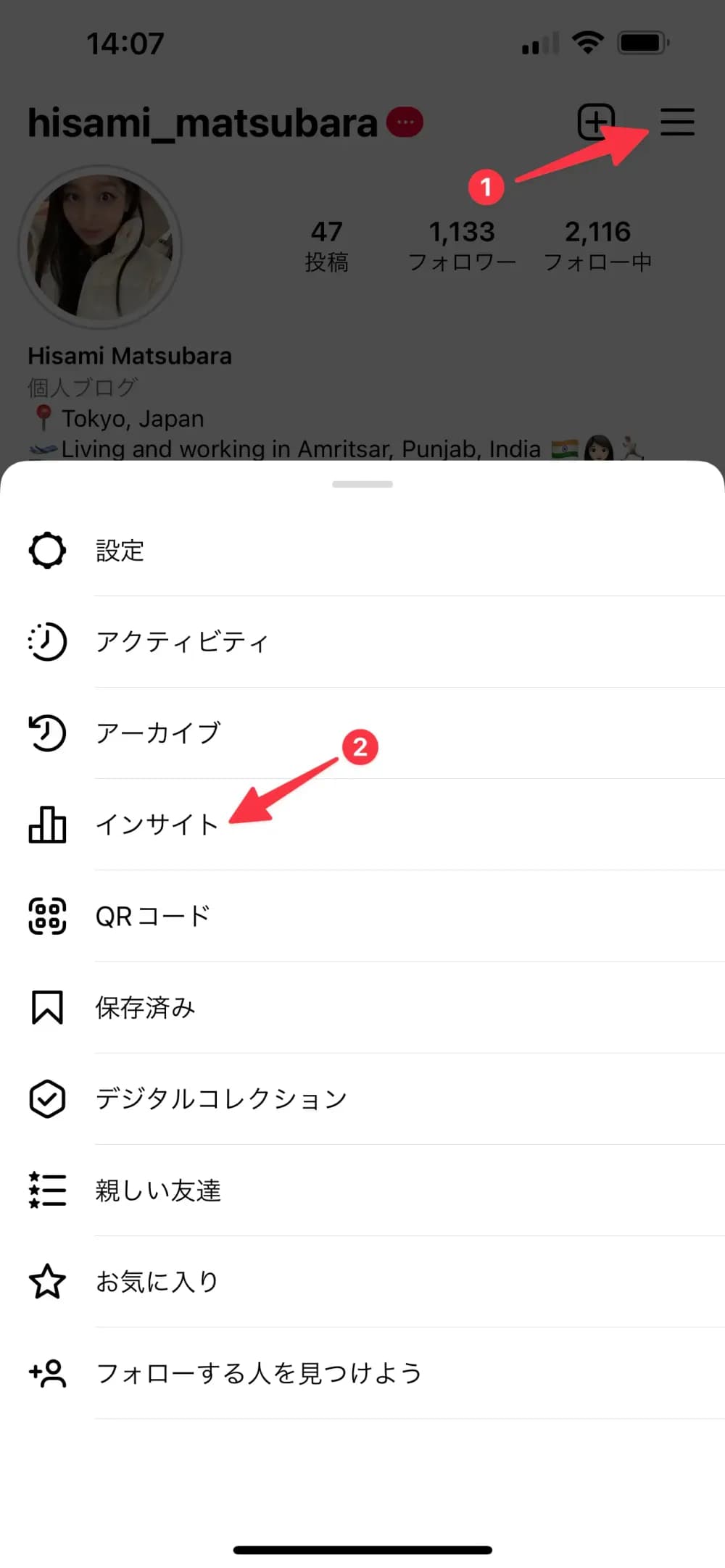 ・自分のプロフィール右上の3点バーガーメニューをタップしてインサイトへ