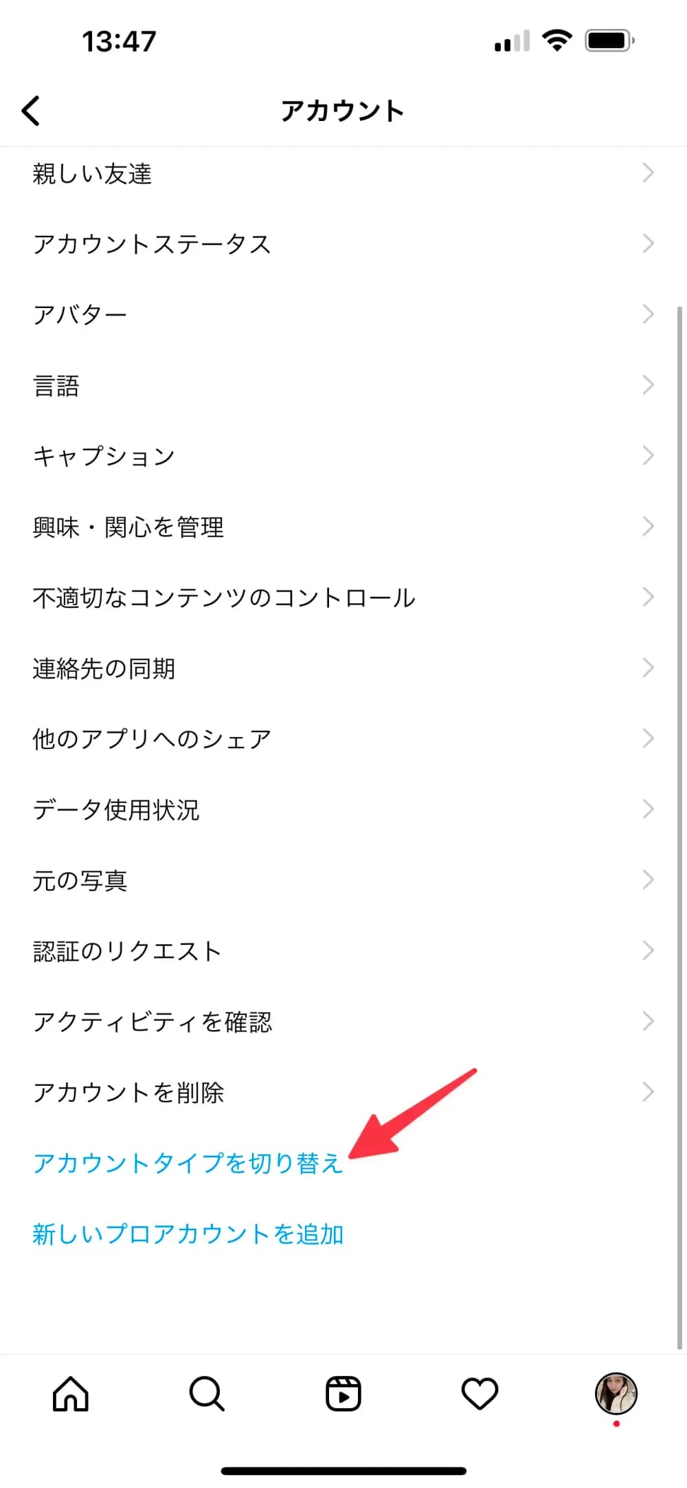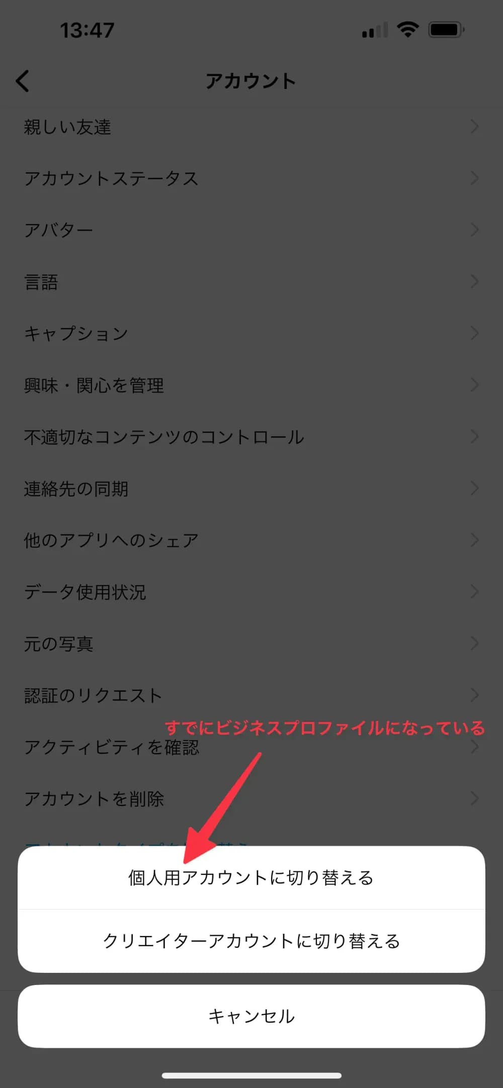 ステップ2: ここをタップして「個人アカウント/クリエイターズアカウントに切り替える」というメニューが出る場合はすでにあなたはビジネスプロファイルをお持ちです。