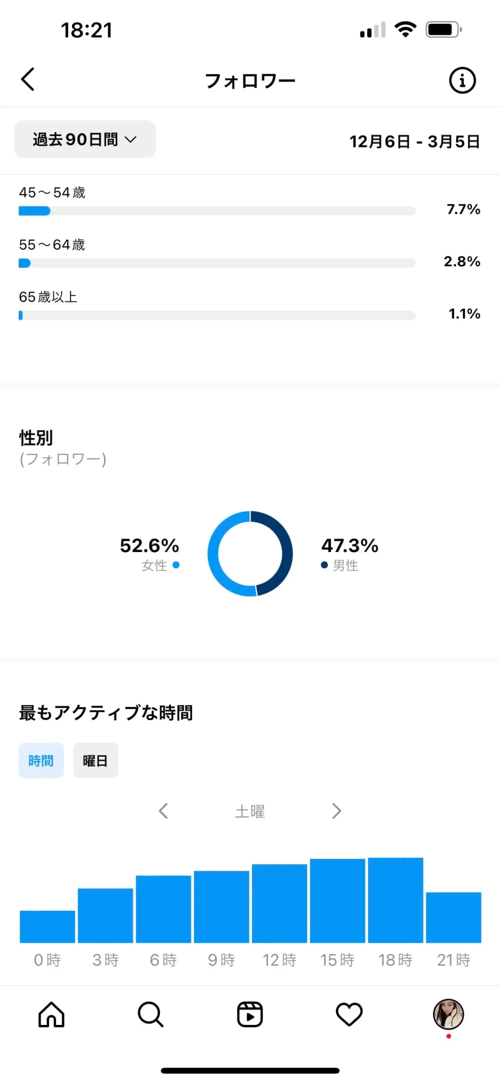 また、もっともアクティブな時間を曜日とタイムラインごとに表示しているので、投稿すべき時間帯の把握にも役立ちます。