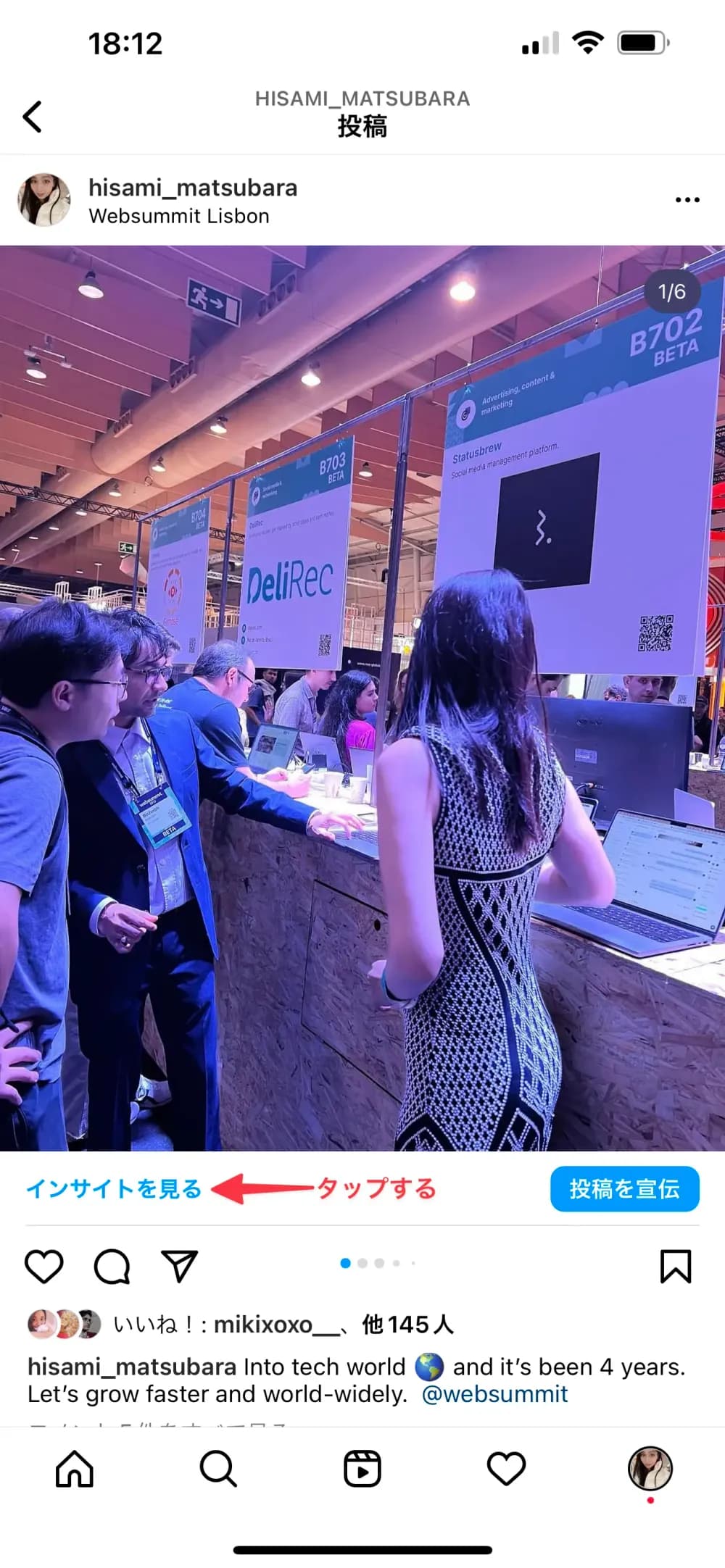 方法2: 直接あなたのプロフィールフィード>該当の投稿>写真(動画)のすぐ下にある「インサイトを見る」をタップしましょう。コメント数、シェア数、保存数、インタラクション数、プロフィールの閲覧数、ウェブサイトのクリック数、アクセス数、フォロー数、ハッシュタグを含むインプレッション数など、主要な指標にアクセスできます。